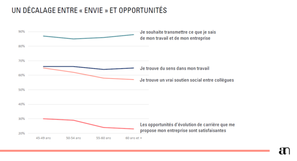Sur l’ensemble du panel, 90% des répondants déclarent « souhaiter transmettre ce qu’ils savent de leur travail et de leur entreprise ». Néanmoins « ils ne sont que 40% à penser que leurs contributions professionnelles sont reconnues à leur juste valeur et seulement 25% pensent que les opportunités d’évolutions de carrière que leur propose leur entreprise sont satisfaisantes. »